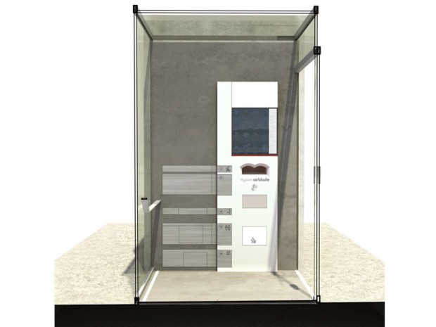 La cabine en verre transparente laisse percevoir l'hygiène du lieu tout en dissimulant les éléments de la colonne sanitaire. Un bloc robotisé à tiroir intègre les fonctions sanitaires : une table à langer, un lave-mains, un dérouleur de papier toilette, un urinoir, un WC adulte et un WC enfant s'actionnent par effleurement. Les matières sont évacuées grâce à un système d'aspiration, assurant économie d'énergie et d'eau. Puis, le tiroir se referme et désinfecte les sièges en coulisse. En haut, un panneau photovoltaïque, un chauffe-eau solaire et un système de récupération des eaux de pluie. A l'intérieur, un réservoir permet de réutiliser les eaux grises du lavabo pour le nettoyage du siège."