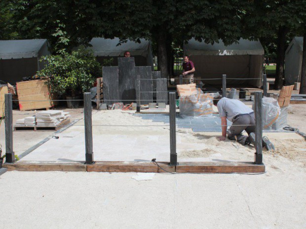 Les piquets de vigne ont été dressés. Le dallage des pierres naturelles touche à sa fin. Le gazon, lui, attend d'être déroulé à l'entrée du jardin. Au milieu des douze projets présentés lors de Jardins Jardin, l'aménagement réalisé par la société Cupastone, parrainé par Maison à part, prend forme en ce moment dans le cadre exceptionnel du jardin des Tuileries à Paris. D'ici à quelques heures, les visiteurs traverseront le mini parcours, imaginé par le producteur de pierres naturelles, via un chemin en pas japonais. "Notre but est de leur permettre de toucher les matériaux et de leur faire découvrir les différentes possibilités d'aménagement de la pierre dans les jardins", explique Sylvain Gueranger, paysagiste chez Cupastone.