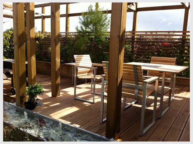 La terrasse met en scène des plantes, des fleurs et même des petites fontaines. Un espace dédié à l'ensemble des salariés présents sur le site.