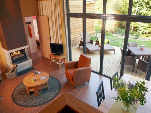 Les 800 éco-cottages, de plain-pied, s'intègrent harmonieusement à l'environnement grâce à l'utilisation du bois et du verre.