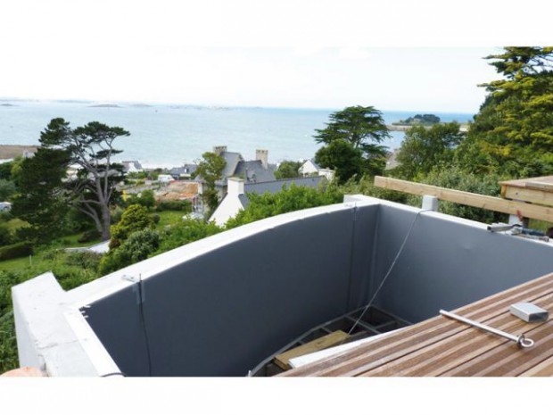 Pour profiter d'une splendide vue panoramique sur la baie de Morlaix (Finistère), les propriétaires d'une maison ont fait construire une petite terrasse sur pilotis, accueillant un bassin à fond mobile. La piscine se transforme en terrasse à l'envi et en quelques instants !