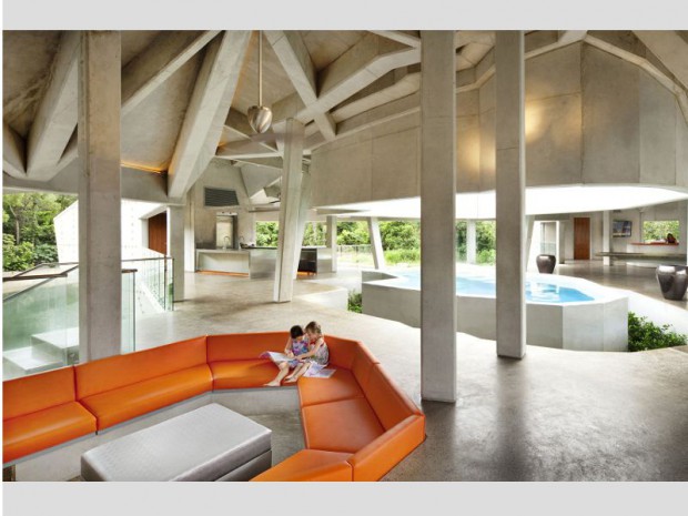 Du fait du climat doux dont la région profite, le concepteur a privilégié les espaces ouverts, autour d'une piscine centrale. Ces espaces de vie flexibles ont tous une orientation différente et une vue sur le paysage environnant. Le cœur de la maison est accessible depuis la terre ferme par une passerelle, qui renforce le caractère unique et isolé de l'habitation.
