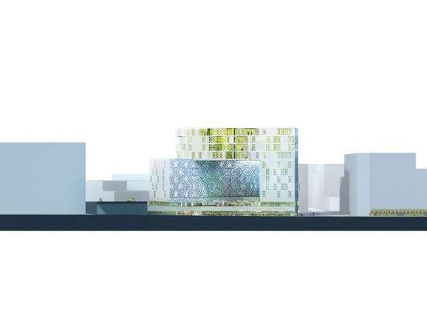 Grâce à son aspect perforé et dentelé, le bâtiment sera facilement identifiable et reconnaissable. «Certains des panneaux métalliques seront ouvrants, avec un système d'ouvertures à la française, d'autres seront fixes. La mobilité de certains d'entre eux augmentera les effets de ses façades, en créant quelques redans de temps en temps», souligne l'agence. C'est donc à un véritable jeu d'effets d'optique que s'est livrée l'architecte, s'amusant tour à tour à laisser de grandes ouvertures puis à cacher les intérieurs. Sans oublier des changements de graphisme à certains endroits éveillant ainsi une empreinte baroque.