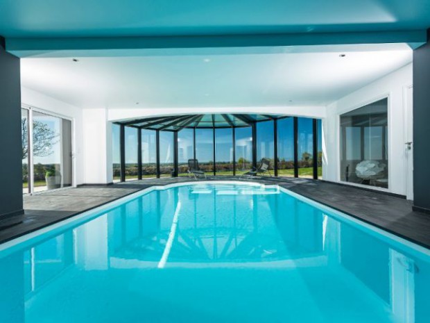 UN PROJET/UNE PARTICULARITE. Les architectes Jacques Seignez et Marine Gouyec ont installé une piscine au cœur d'une maison contemporaine de Concarneau. Pour la protéger, une véranda semi-circulaire, dont façade et toiture coulissent, permet aux habitants de profiter d'une vue imprenable sur les îles Glénan.