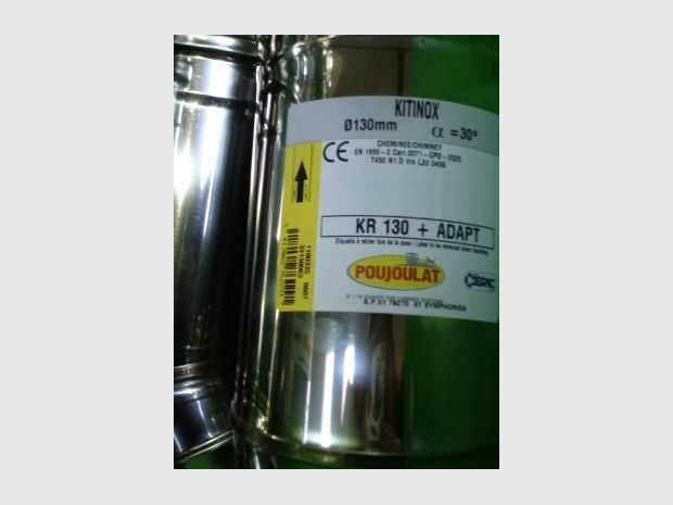 Une étiquette Poujoulat est apposée sur chaque produit, avec un code barre, l'indication du sens des fumées, et le marquage de la norme CE.