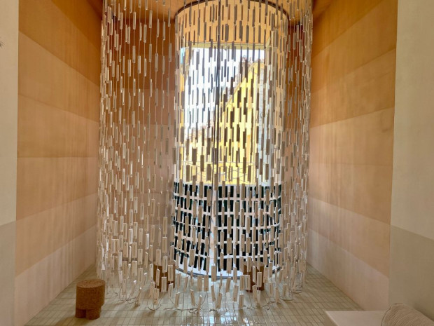 Anaïs Fernon a remporté le Prix du Mobilier national et la dotation de la Fondation Carmignac. La Française diplômée de l'École supérieure des arts appliqués Boule et de l'École nationale supérieure de l'architecture de Versailles s'intéresse à la fenêtre et la lumière, et fait appel à nos sens. Dans une petite pièce du second étage de l'Ancien Évêché, elle a réinventé le rideau de perles provençal. Son installation repose sur deux couches de rideaux qui se succèdent. Un premier, une moustiquaire pare-feu paré de pampilles d'aluminium miroir renvoie les rayons directs du soleil vers l'extérieur et arrête les nuisibles. Le second, composé de cordons de lin et de barrettes de terre cuite chaulées, est gorgé d'eau par goutte-à-goutte. Ainsi, l'air traversant se transforme en douce brise, et l'installation fait office de climatisation naturelle. Un dégradé de peinture aux murs, partant du blanc, au sol, à l'ocre, au plafond, symbolise la hausse des températures en été.