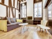 Pour ne pas dénaturer l'intérieur, l'architecte a choisi de mettre en valeur les poutres anciennes. "Leur côté rustique tranche avec le style contemporain du reste de l'appartement. C'est aussi une manière de conserver l'esprit historique du quartier" nous confie Benoît Dufour. Il a également joué sur la verticalité en habillant les fenêtres de noir, et installé des volets en bois intérieurs qui accentuent l'impression de grande hauteur (3,25 m sous les poutres). "Pour éviter les espaces perdus, des rangements ont été aménagés sous les fenêtres, ainsi qu'un placard fermé sous la télévision, qui permet de ranger les câbles, la box..." ajoute l'architecte.
