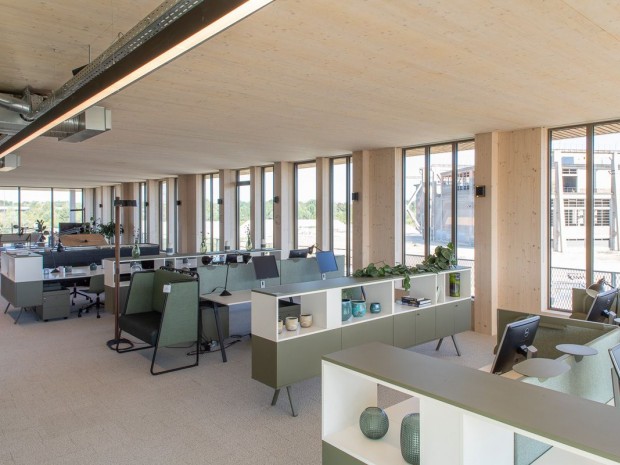 Confort, espace, bois, nature. Les espaces de travail bénéficient de larges baies vitrées et d'une hauteur sous plafond importante. Le showroom permet de se rendre compte de l'ambiance de travail proposée. L'agence Saguez&Parners a sélectionné "des matériaux durables et du mobilier tout bois et intelligent." Le faux plafond est remplacé par une dalle apparente en bois CLT. Les plateaux prévus iront de 2000 à 5000 m2.