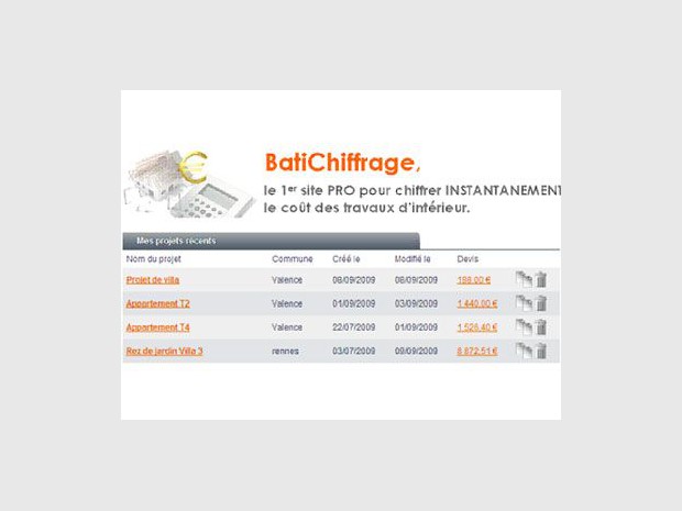 BatiChiffrage est un outil en ligne (www.batichiffrage.com) permettant de chiffrer ou d'estimer le coût de travaux de second œuvre et d'équipements techniques. A partir d'un questionnaire interactif proposé par le système, l'utilisateur décrit son projet de construction ou de rénovation, puis obtient instantanément un devis ou une estimation de ses travaux.