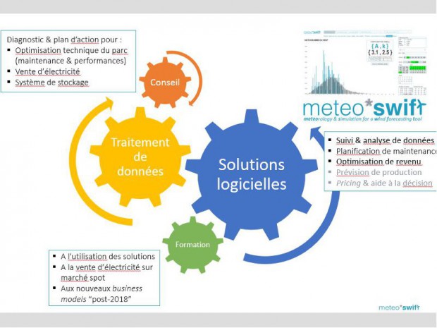 Pour cela, Meteo*swift utilise l'intelligence artificielle, qui apporte une vraie rupture. On peut ainsi manipuler un grand nombre de données et obtenir des prévisions de bien meilleure qualité. L'utilisation de méthodes statistiques complexes permet également de donner des prévisions plus précises. A l'arrivée, Meteo*swift fournit des prévisions adaptées à chaque type de parc éolien, sous forme probabiliste et intégrant les prix variables de l'électricité, pour en faire un outil complet d'aide à la décision sur les nouveaux marchés de l'électricité.