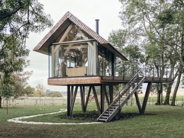 Perchée à environ quatre mètres du sol, la maison peut être vue comme une cabane dans les arbres ou comme un nid d'oiseau. Cette hauteur génère "un sentiment de sécurité et d'intimité", estime l'architecte.