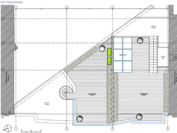 Le quatrième étage de la maison de gauche comprend la cuisine donnant sur une terrasse de presque 20 m².