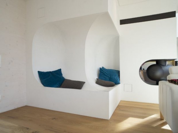 La créativité est au centre de la maison. Comme en témoigne ces incroyables assises murales. On pourrait imaginer qu'une cuillère est venue "grignoter" le mur blanc du salon. Toute la famille peut se lover dans ces nids et profiter d'un agréable moment de repos. En arrière-plan, le poêle se niche lui aussi dans une cavité arrondie. Le tout est visuellement géométrique et empreint de folie.