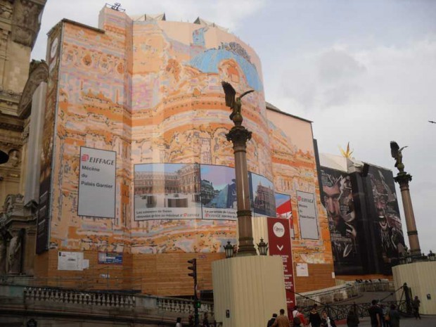 Pendant la durée des travaux de rénovation de l'aile Ouest de l'Opéra de Paris, Eiffage, mécène de l'opération, a installé une bâche géante sur ce chantier en plein cœur de la capitale.