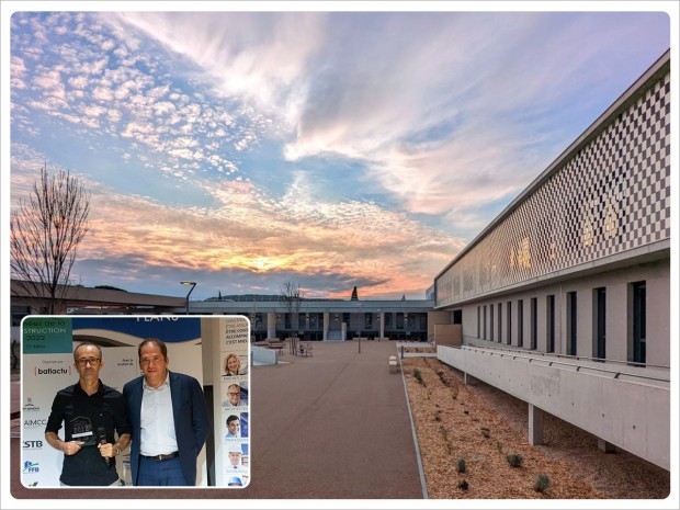 Construction du collège Voltaire à Remoulins. La particularité du projet est d'être construit sur pilotis en zone inondable en combinant des exigences environnementales fortes : bâtiment durable Occitanie niveau Or, bâtiment BEPOS.