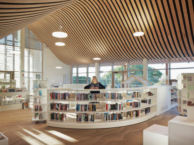 Pour accéder à la médiathèque, il suffit d'emprunter l'escalier ou l'ascenseur. Cet espace de 600 m² offre un plateau unique baigné de lumière, pouvant accueillir jusqu'à 300 personnes. Un long mur traversant la salle abrite les locaux du personnel, les sanitaires et les locaux techniques, organisant l'espace de manière fonctionnelle.