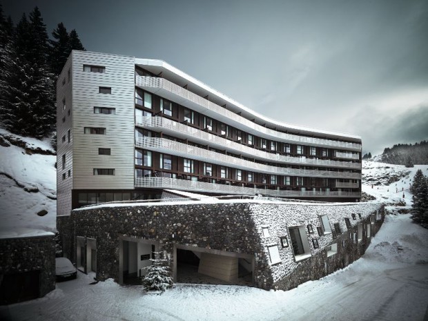 Implantée à 1.600 m d'altitude, dans la station de ski de Flaine (Haute-Savoie), entre deux bâtiments de Marcel Breuer, figure emblématique de l'architecture moderne, la nouvelle résidence de tourisme "Le Centaure" conçue pour le promoteur immobilier MGM s'adosse à la montagne.
