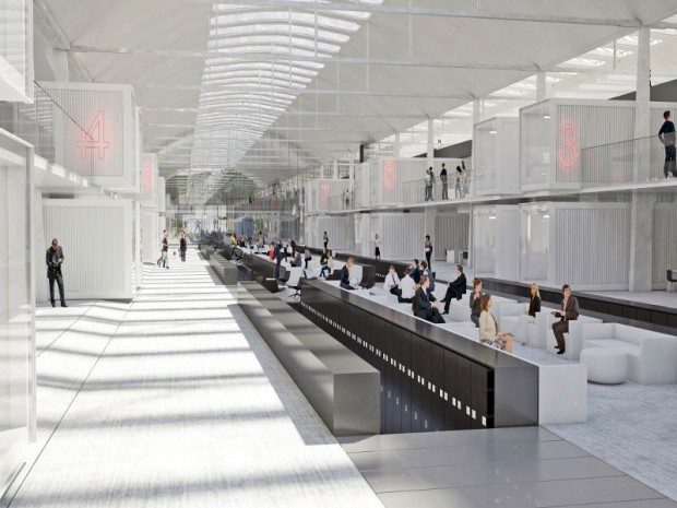 Les équipes Jean-Michel Wilmotte se sont aussi inspirées des containers postaux qui autrefois acheminaient le courrier, dans le but de concevoir des espaces de bureaux. La halle se subdivisera dans quelques mois en trois espaces bien distincts. "En prolongement d'un vaste parvis minéral, un centre d'accueil et de rencontre proposera des salles de réunion et un grand auditorium de 500 places enterré sous la halle", ajoute l'architecte.