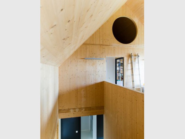 Milena Karanesheva a fait le choix d'ouvrir les combles sur le premier étage. Seuls deux petites ouvertures (à droite sur la photo), de part et d'autre de la pièce centrale, accessibles grâce à une échelle, permettent de se rendre sous les combles. "Pour que les enfants s'amusent, nous leur avons créé une salle de jeux un peu originale, et en cas de besoin, cet endroit nous sert de chambre d'amis", précise Éric.