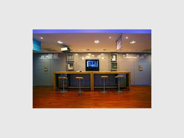 Espace où le client va discuter de son projet avec le vendeur. C'est la phase de concrétisation. Le sol en revêtement tissé beige, le mur blanc et le plafond bas jouent la ressemblance avec un appartement.