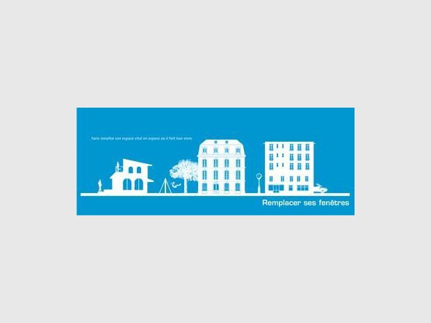 Des pictogrammes symbolisant les applications de l'ensemble de la gamme Technal sur des immeubles, résidences, maisons… défilent comme une histoire et matérialisent les espaces de vente.