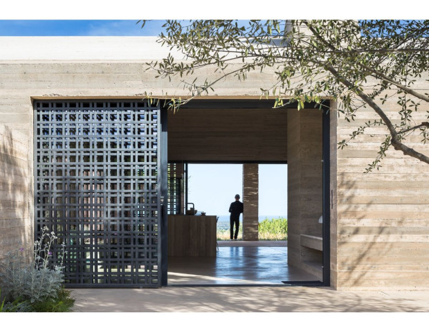 Une grande partie du mobilier intérieur et extérieur a été réalisée avec du travertin massif issu des carrières du Lazio, près de Rome. La pierre a été laissée brute et n'a ainsi reçu aucun traitement, afin de magnifier sa matière calcaire sédimentaire grège. Les volets coulissants ont, eux, été fabriqués avec des planches de bois réemployées