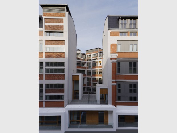 "Les façades sur cour, mises sous cloche par la présence d'une verrière jusqu'à mi-hauteur, ne constituaient que des vues d'une qualité altérée où le regard rebondissait de façade en façade, détaille le porteur du projet. Ce qui pouvait être admis pour des ateliers ne pouvait être viable pour des logements." Il a donc été nécessaire de requalifier la cour et la façade sur rue, en retirant la verrière et une travée au sud, créant ainsi une ouverture pour laisser pénétrer la lumière, mais aussi pour offrir des vues et améliorer l'acoustique des façades sur la cour.