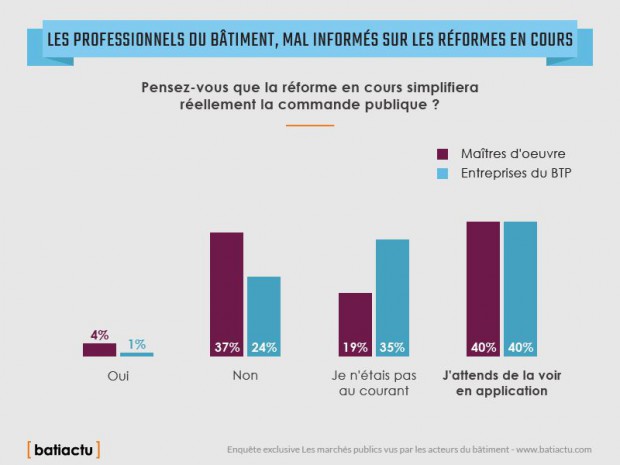 Alors que le ministère de l'Economie a entrepris une réforme des marchés publics en vue de les simplifier, l'enquête de Batiactu révèle que les professionnels de la construction sont mal informés. Seuls 4% des maîtres d'œuvre et 1% des entreprises du BTP estiment que la réforme en cours simplifiera la commande publique. A l'inverse, plus d'un quart des sondés pensent que cela ne sera pas plus simple. Ils sont 40% à être sceptiques et attendent de voir la réforme en application. Enfin, ils sont 35% des entreprises du BTP et 19% des professionnels de la maîtrise d'œuvre à dire qu'ils n'étaient pas au courant.
