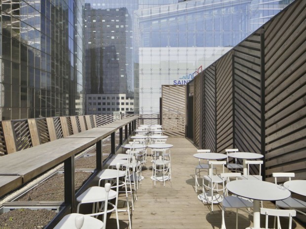 Concernant la toiture, un traitement de cinquième façade, visible depuis tous les étages supérieurs des tours avoisinantes, a été ajouté. Le reste de la toiture accueille une végétation importante, afin de "donner l'effet d'une plantation développée". Un bac potager est également prévu pour permettre la culture des produits pour les restaurants. Une partie du toit-terrasse, soit 39 m², est accessible aux clients, en passant par un escalier intérieur en bois. Il offre une vue sur le paysage urbain des alentours, et "permet d'être au pied des tours", indique Gaston Tolila.