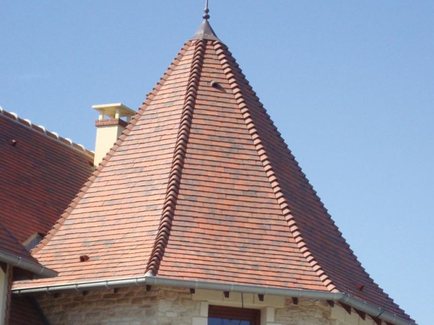 Les propriétaires de cette belle villa ont confié la réalisation de la toiture à l'entreprise Thorel Eric pour mettre en oeuvre des tuiles léonard St Vincent rouge ardent. Les arêtiers encastrés des lucarnes, la tourelle surmontée par un poinçon, les noues fermées, le façonnage des crêtes de coq et des embarrures des faîtières et des abouts, les finitions des rives, zingueries, solins et lucarnes : tous les éléments de cet ouvrage rivalisent de minutie dans leur exécution. Et ce foisonnement de précision a justement sensibilisé le jury !