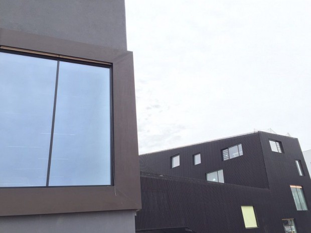 Particularité, les fenêtres sont implantées en saillie sur le bâtiment Nord, "sortes de bow windows modernes", qui donnent une dynamique à la façade des ateliers. Les seules touches de couleur de l'édifice sont d'ailleurs apportées par les rideaux et stores qui ornent ces ouvertures et les grandes baies des ateliers. Ces dernières mettent en scène les artistes dans la ville, visibles depuis la rue. A l'intérieur, les profonds encadrements réalisés en lamellé-collé créent des consoles accueillantes où les étudiants peuvent s'installer pour travailler, réviser ou discuter de leurs projets, tout en appréciant la vue et en profitant de la lumière naturelle. Du côté de la Maison Signe, les fenêtres sont disposées de façon irrégulière, à cause des différences de hauteur sous plafond, mais également à cause de la "logique de distorsion du polyèdre pour aboutir à une forme cristalline".