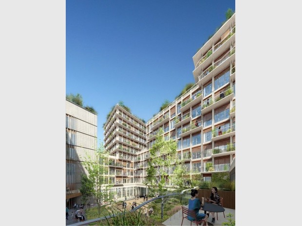 Quelle sera l'utilisation réservée aux 950 m² de rez-de-chaussée sous la partie logements ? "Des commerces avec des enseignes urbaines, comme un atelier vélos, de la restauration avec un café concept store, un chocolatier, un brasseur… Peu d'enseignes internationales, plus de local pour répondre à une urbanité nouvelle", évoque l'architecte français. A noter que le café s'ouvrira vers le cœur d'îlot, partagé avec le campus universitaire. Une œuvre d'art monumentale de Janet Echelman ornera l'endroit, sous la forme d'une installation légère à base de filets colorés, suspendus aux immeubles les plus hauts, donnant l'illusion de nuages multicolores.
