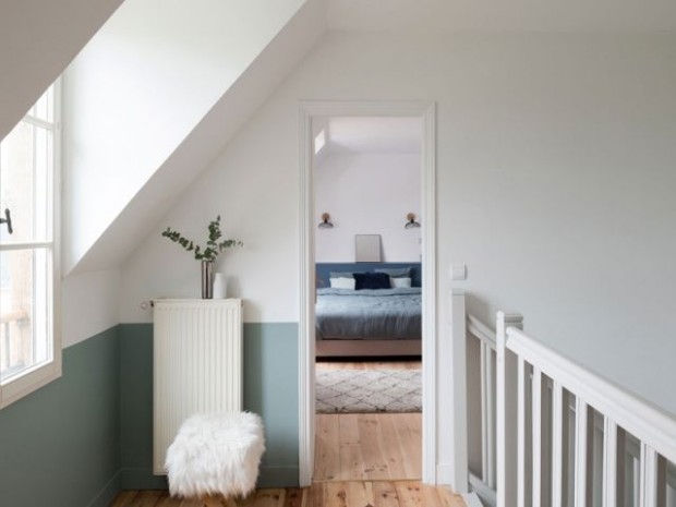 A l'étage, les pièces sont, là aussi, inondées de lumière. Les architectes ont une nouvelle fois travaillé des couleurs claires. Petite astuce pour donner une impression de hauteur : "au lieu de monter jusqu'à l'angle, la peinture s'arrête à mi-hauteur. La soupente est assez basse, ça crée une illusion de plus grande hauteur" explique Patricia Coignard, qui a utilisé le même subterfuge dans la chambre parentale.