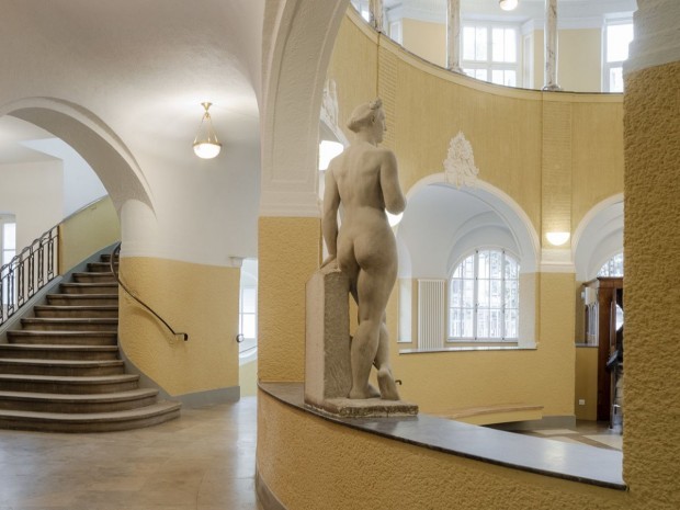 Lorsqu'il ouvre en 1908, l'édifice est considéré comme étant révolutionnaire pour l'époque. À l'intérieur, on pouvait y trouver des piscines intérieures, des douches publiques, un sauna, un solarium et même… un espace de toilettage pour chiens. L'architecte Fritz Beblo avait voulu insuffler un style antique et néo-régional au béton technique utilisé pour la construction.