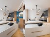 Plutôt vaste et très lumineuse, la pièce à vivre avait cependant un gros inconvénient : un angle très pointu dans le salon. "C'était l'un des plus gros défis de ce projet" confirme Patricia Coignard. "L'angle étant vraiment très prononcé, ça compliquait les choses pour aménager la pièce. Comme on ne pouvait pas le supprimer, il a été intégré dans le dessin de l'estrade". L'architecte d'intérieur a aussi fait en sorte de le gommer visuellement avec une peinture foncée, qu'elle a appliquée en diagonale façon trompe-l'œil. Elle a également installé deux petits claustras pour délimiter visuellement le coin salon. "Cela permet en plus de l'isoler un peu de la cuisine sans occulter la lumière" note Patricia Coignard.