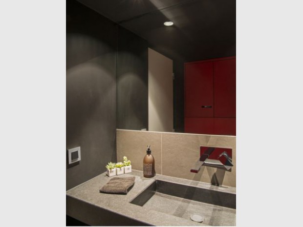L'architecte a souhaité mélanger les matériaux et les couleurs pour créer une ambiance originale. Le mur principal de la pièce est noir et ressemble à de l'ardoise, tandis que la surface proche du lavabo est beige et rappelle la pierre naturelle.