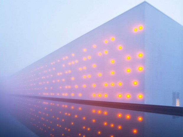 Enfin, de nuit, le bâtiment propose un jeu d'éclairage grâce à des spots leds et des leds incrustés de manière aléatoire dans les trous de banche.
